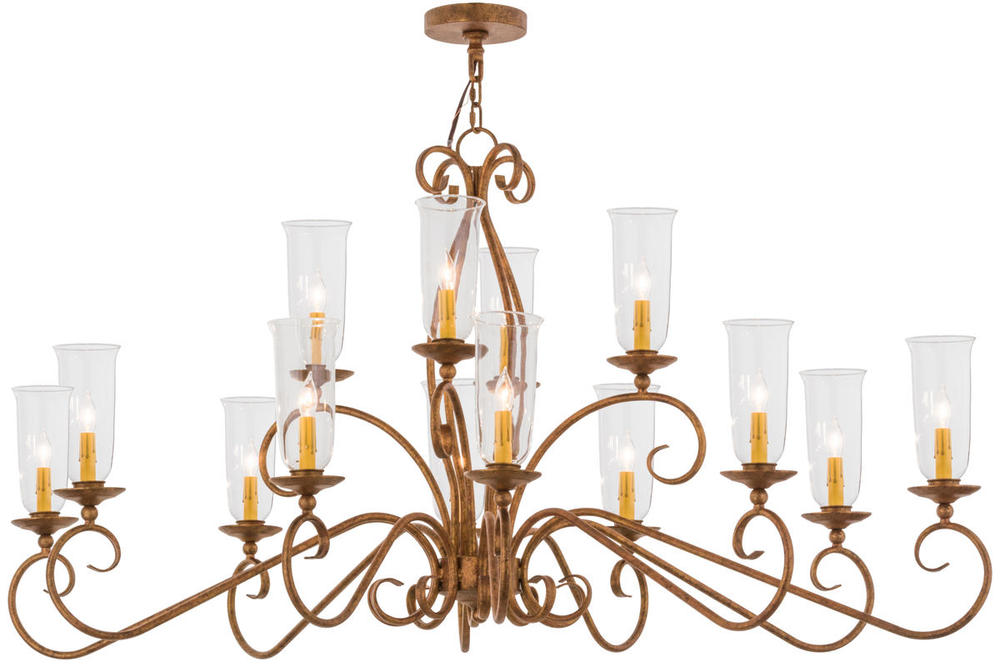Romantic charm and elegance come to light with the Wallis chandelier, which features 14 Clear Glass Hurricane shades adorned with faux candlelights, perched on bobeches attached to scroll designed arms. The hardware and accents are highlighted in a stunning Autumn Leaf finish. Handcrafted by the highly skilled hands of artisans in our 180,000 square foot manufacturing facility in Yorkville, New York. Custom colors, styles and sizes are available, as well as dimmable, energy efficient lamping options. UL and cUL listed for damp and dry locations.