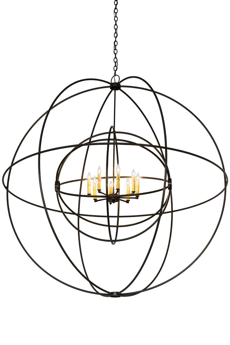 Like a complex gyroscopic structure, Timeless Bronze finished steel rings create a unique curvature pattern that evokes the illusion of revolutionary motion like a spinning gimbal rotating on its axis. The orbed frame envelopes a smaller frame similar to one that represents atomic energy, which wraps around an elegant faux 8-light Amber-colored faux candelabra. Custom crafted in the USA, this fixture is available in custom colors, designs and sizes, as well as dimmable energy efficient lamping options. UL and cUL listed for damp and dry locations.