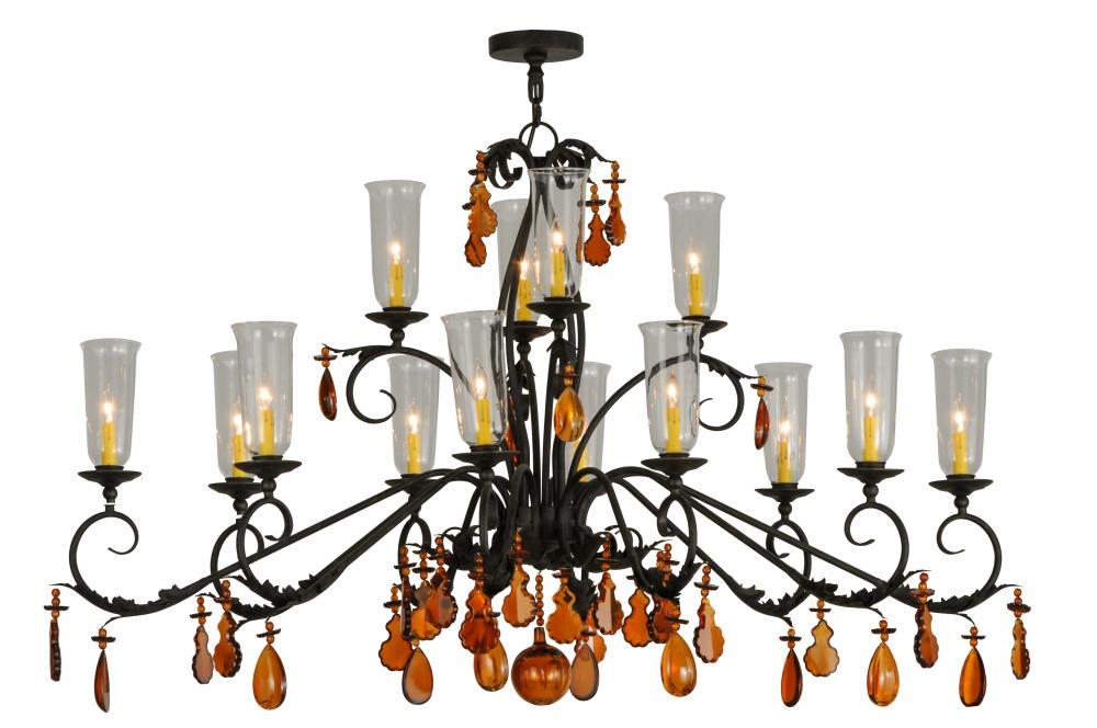 Inspired by the beauty and grace of ballrooms in renowned castles and mansions spanning the globe, Windsor features 14 Clear Glass Hurricane styled shades that reveal Ivory faux candle lights. The elegant shades are embraced with bobeches with Acanthus Leaf Accents and Amber Crystal Orb and Pendalogs on a frame with hardware featured in a Chestnut Textured finish. The overall height ranges from 43 to 150 inches as the chain length can be easily adjusted in the field to accommodate your specific lighting application needs. Handcrafted by highly skilled artisans in our 180,000 square foot manufacturing facility. Available in a wide range of custom choices including various finishes and sizes. UL and cUL listed for dry and damp locations.