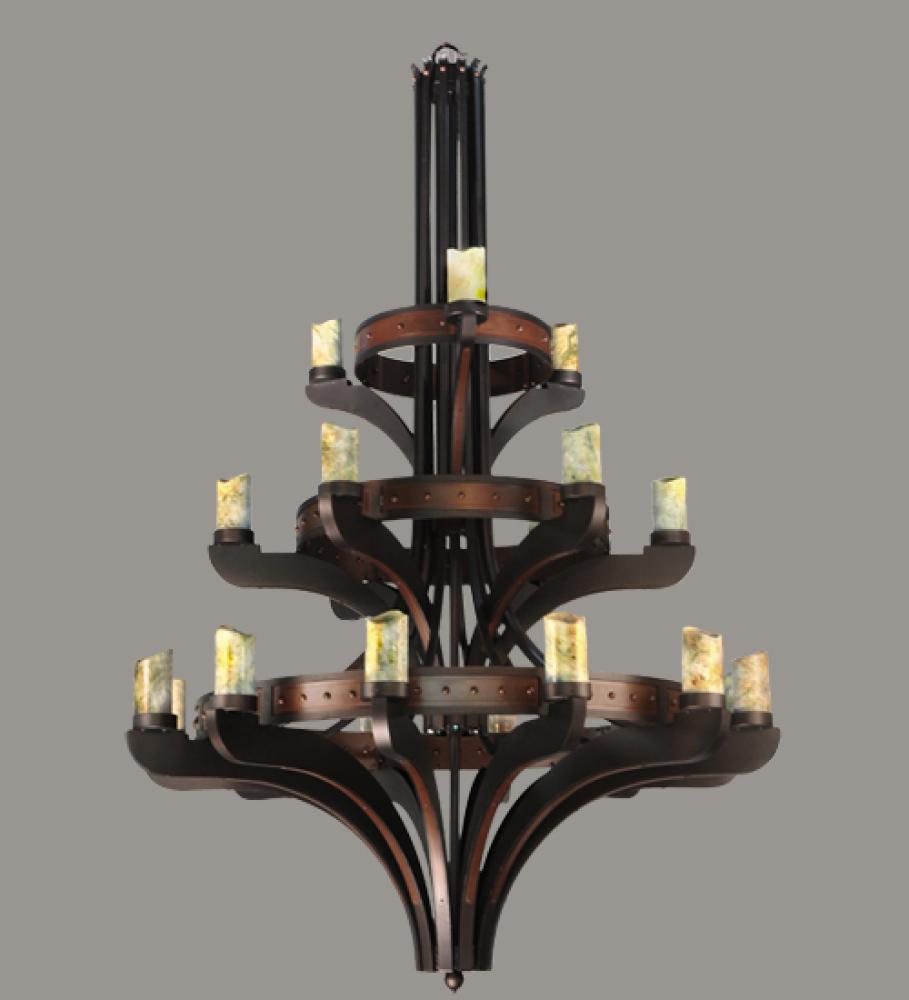 Decorative and enchanting, rich charm and elegance come to light with the Castilla chandelier, which is designed as a dramatic centerpiece for foyers, ballrooms and other large spaces. The 3-tier fixture features 21 Jadestone Cylindres perched on bobeches with hand-forged Iron hardware featured in 2 complementary Mahogany Bronze finishes. Handcrafted by highly skilled artisans in our Upstate New York manufacturing facility, this fixture is available in custom sizes, styles, colors and dimmable energy efficient lamping options such as LED. This chandelier is UL and cUL listed for damp and dry locations.