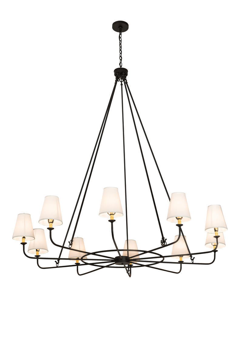 An exquisite articulation of beautiful ambient lighting and graceful design, the Brach Ring chandelier features a stunning centerpiece with 10 curved arms. White Textrene shades crowning faux candlelights are perched atop of diminutive bobeches. The chandelier is highlighted with stunning Hand-formed Iron hardware hand finished in a Black Textured hue. Custom crafted by in our 180,000 square foot manufacturing facility in Yorkville, NY. Custom sizes, designs, colors and dimmable energy efficient lamping options are available. The 6 foot wide chandelier is UL and cUL listed for damp and dry locations; however we do not recommend installing it in spaces that experience a large amount of moisture due to the fabric shades.