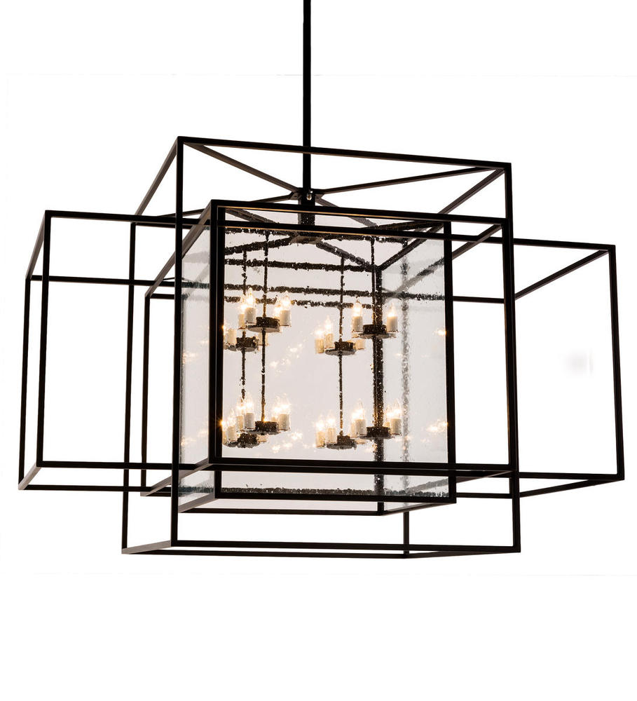 A modern, architecturally styled fixture is designed with a pizazz that is unique, fresh and stylish. Give your decor an extra edge with this innovative fixture featuring a Clear Seeded Glass cube within open frameworks of three larger Solid Steel cages. Suspended inside the cube are 32 faux candlelights. The elaborate frames and hardware are finished in Black. Handmade in our 180,000 square foot manufacturing facility in Yorkville, New York. Dimmable energy efficient lamps, as well as custom sizes, styles and colors, are available.