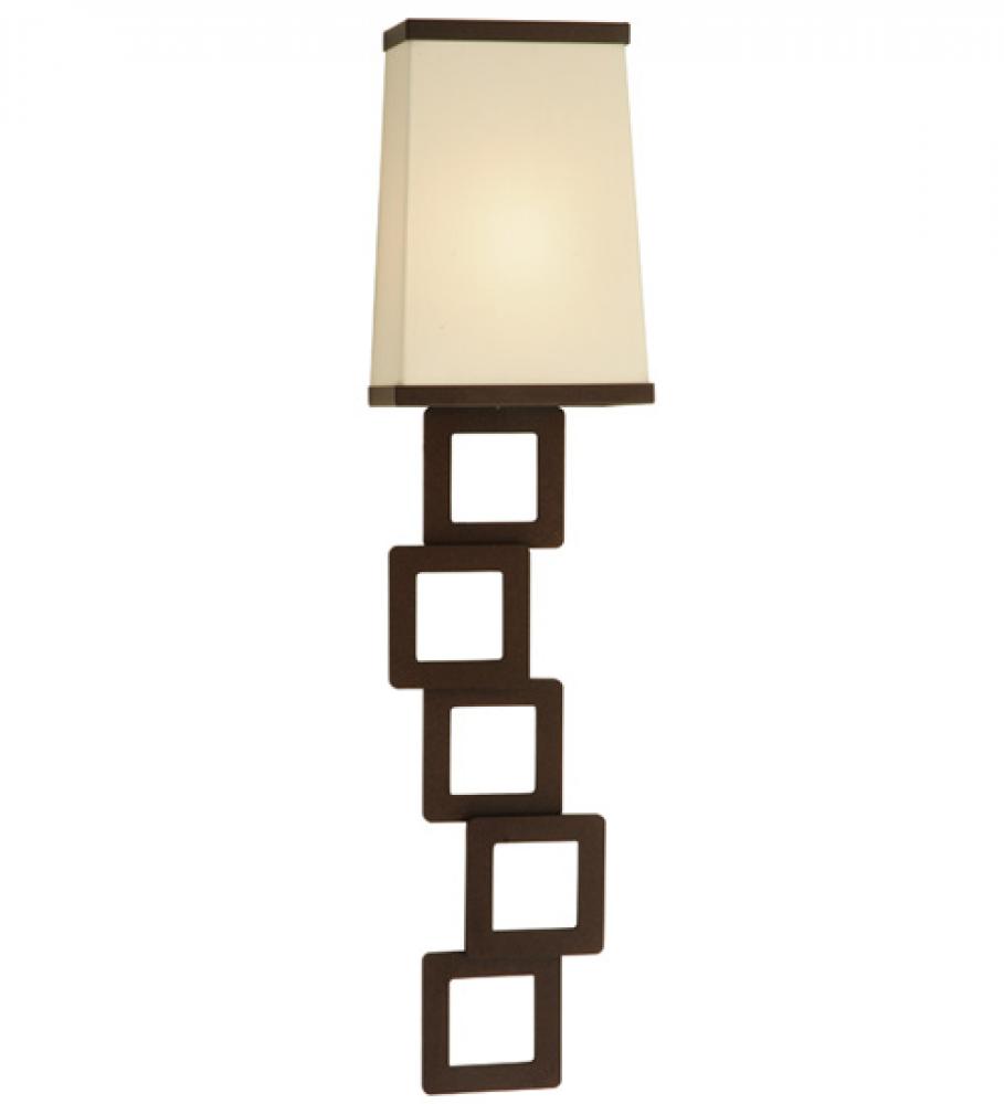 Elegant geometry. A geometric stacked frame features five cube like metal elements in a Cafe Noir finish that are crowned with an Antique Cream Textrene shade. Handmade in the USA, this wall luminaire is available in custom sizes, designs and finishes, as well as dimmable energy efficient lamping options. The 30-inch tall fixture is UL and cUL listed for dry and damp locations.
