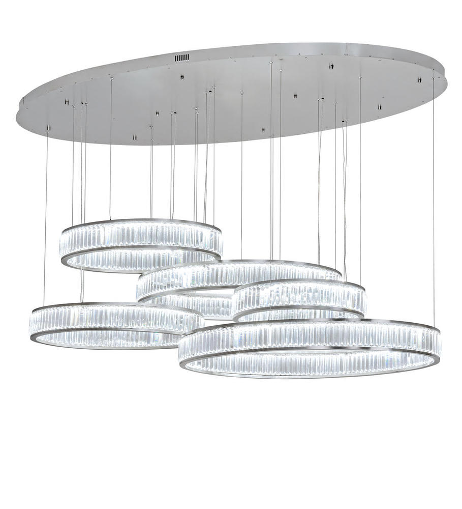 Luxurious jewelry inspired elements elevate this design aesthetic to a new level. Five rings of exquisite Clear Crystal Baguettes provide a prismatic brilliance while illuminated by Integral LEDs for energy efficient ambient light. This cascading pendant is enhanced with a Brushed Stainless Steel finish. The five rings can be adjusted in a variety of configurations and the overall height ranges from 34 to 96 inches as cable lengths can be easily adjusted in the field to accommodate your specific lighting application needs. The number of crystals, metal finishes and fixture size can be customized. UL and cUL listed for dry and damp locations.