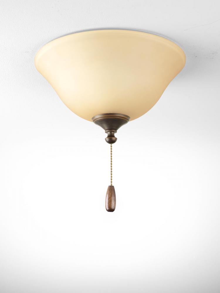 Antique Bronze two-light fan kit with etched Light Umber glass bowl. Elegant light umber glass conceals light bulbs and casts an inviting illumination in any size room. Universal style lets you use with any indoor fan that accept an accessory light. Quick-connect wiring makes the installation process quick and easy.