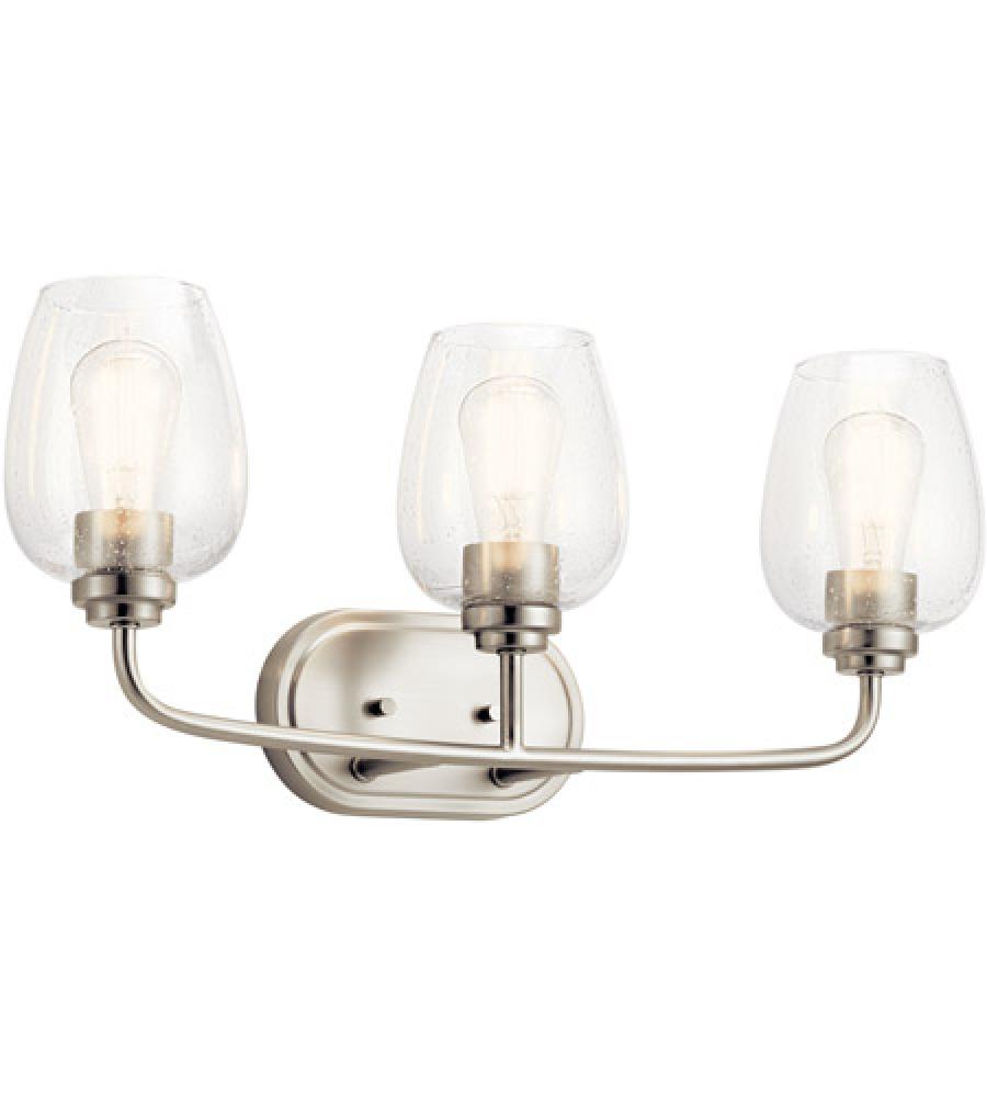 The Valserrano 24 inch 3 light vanity light features wine goblet shaped clear seeded glass shades with a clean design in Brushed Nickel finish. A perfect addition in several aesthetic environments including transitional, traditional or farmhouse decor.