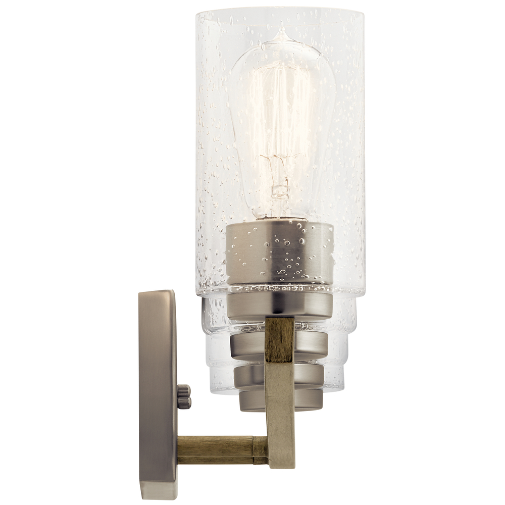 The 4-light wall mount from the Deryn™ bath collection delivers a minimalist style with crisp, clean lines and angled structure. Accented with Clear Seeded Glass and a Distressed Antique Grey finish, the fixture makes an excellent addition to refined rustic and coastal bath settings.