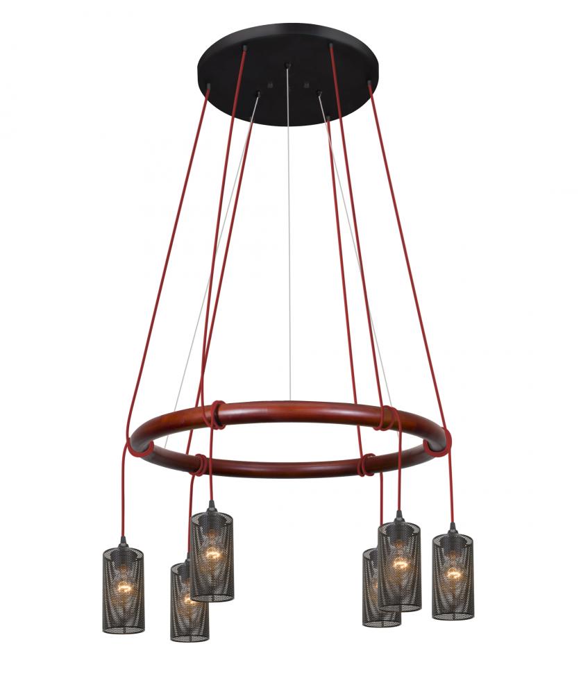The Cirque 120V chandelier artfully merges modern stylings with old world woodworking, resulting in an ideal complement to any Rustic or Farmhouse Modern environment.  Each of the six suspended lampholders offer a soft ambient presence, while the flexible cord drops playfully interact with the stained real wood ring.  The optional black mesh shades soften the lighting effect by effectively diffusing the light source, while projecting an overall more industrial look.   These stylish and functional luminaries are offered in a beautiful Black finish.