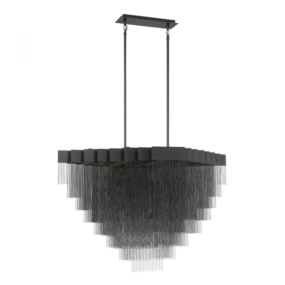 A lustrous collection of delicate, high-gloss metal chains cascade like gleaming streams of water in this transitional piece. Resembling armored chain mail, the polished, plated mesh envelops each integrated LED light to add a soft, shimmering glow.