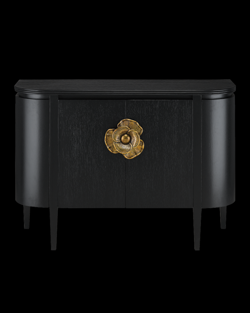The impressively sized brass flower pull on the Briallen Black Demi-Lune Cabinet is a stunning ornamentation. Contrasting the Caviar black stain, the floral motif in an antique brass finish brings the black cabinet a sophisticated feel and illustrates the skill of our artisans who hand-cast the handle in brass.