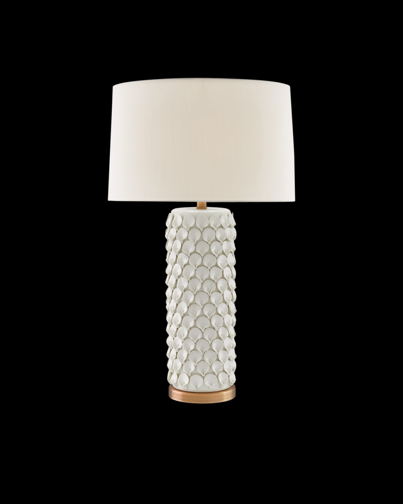 Intricate hand-formed ceramic flower petals cover the surface of the Calla Lily Table Lamp. The textural interest of the petal-covered column is heightened by the antique brushed-brass accents. The white lamp is topped with an eggshell shantung shade that completes this pretty composition.