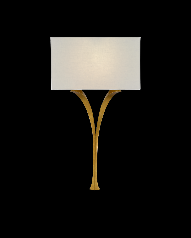 The delicately beautiful Choisy Wall Sconce is made of wrought iron in an antique gold leaf finish. The winsome curve of the wishbone shape and the slight flare at the bottom bring this gold sconce gracefulness. The sconce is fitted with a rectangular white linen shade.