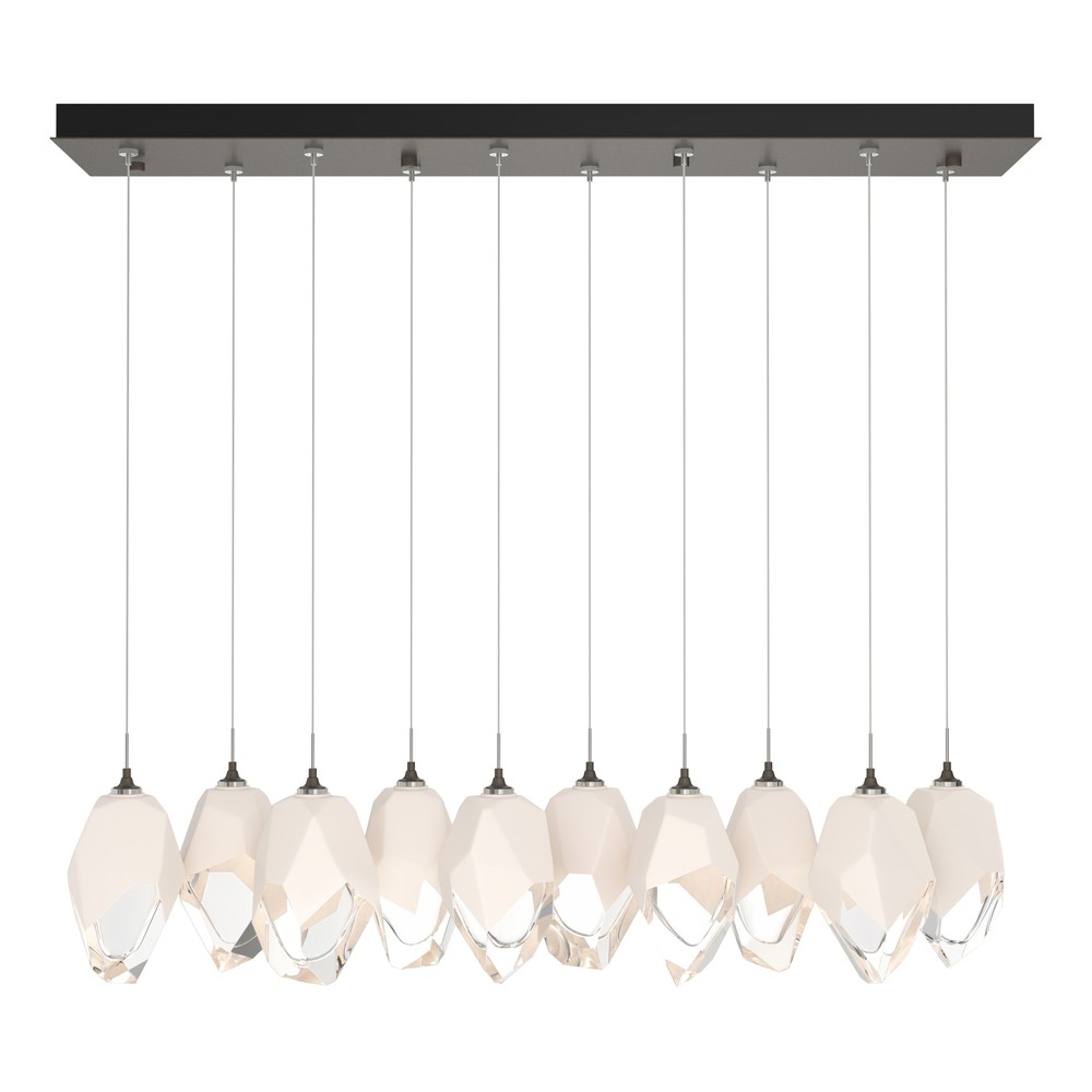 Ten Large Chrysalis pendants hung from a rectangular canopy. Each pendant may be individually adjusted for a custom look. Note, the upper canopy can will always be black while the canopy faceplate will match the selected finish.