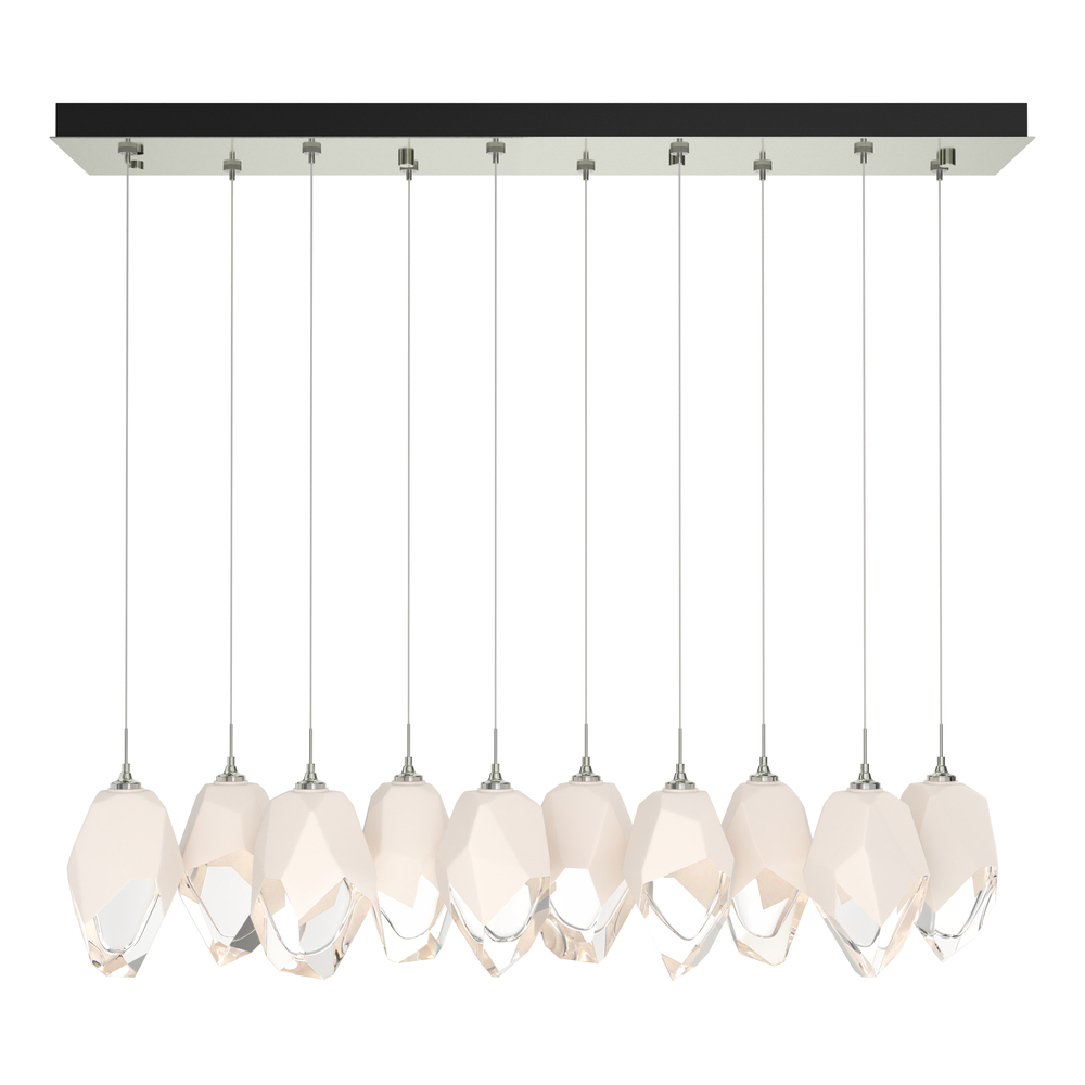Ten Large Chrysalis pendants hung from a rectangular canopy. Each pendant may be individually adjusted for a custom look. Note, the upper canopy can will always be black while the canopy faceplate will match the selected finish.
