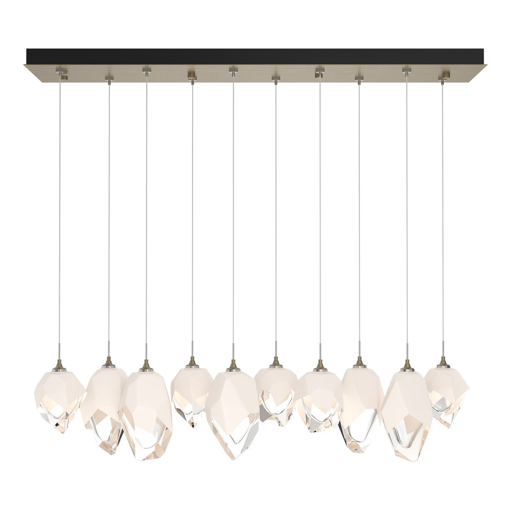 Five Large Chrysalis pendants and five Small Chrysalis pendants hung from a rectangular canopy. Each pendant may be individually adjusted for a custom look. Note, the upper canopy can will always be black while the canopy faceplate will match the selected finish.