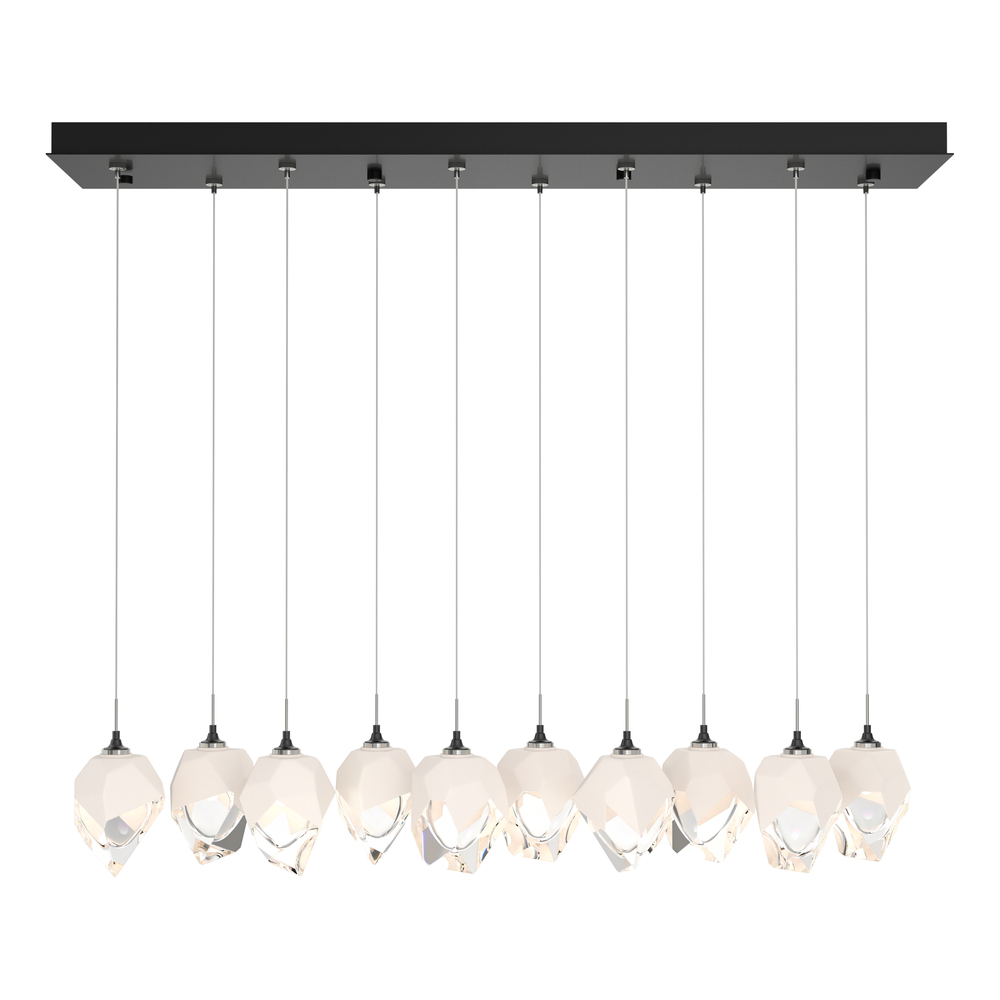 The Chrysalis 10-Light Small Crystal Pendant is a multi-port fixture that features ten small, handcrafted faceted glass crystals suspended from a rectangular canopy. A thick, clear layer of glass is encased in an outer cocoon of hand-blown, colored glass (matte black or white; all 10 are same color). Hand-polished like a gemstone, the lower portion of the outer layer of glass is removed to reveal the inner crystal clear layer below. Each crystal is lit from within.