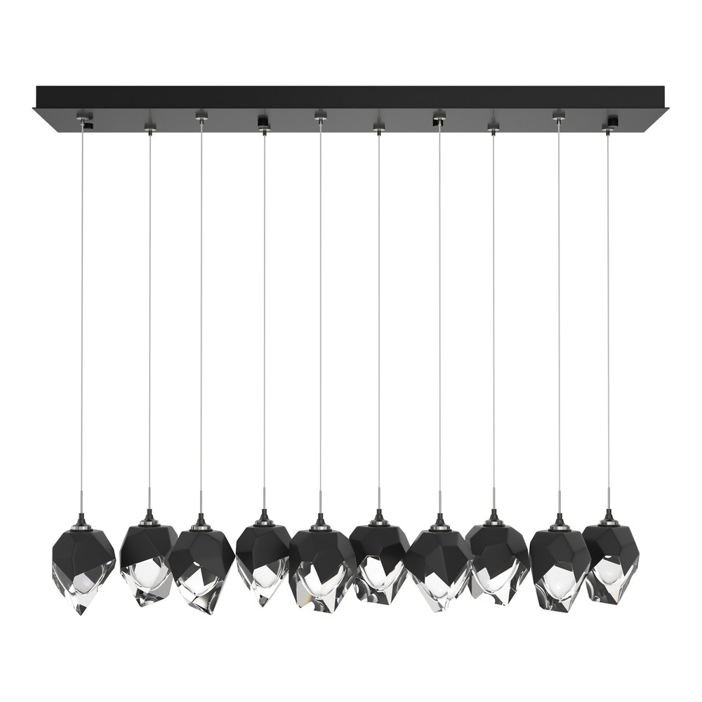 The Chrysalis 10-Light Small Crystal Pendant is a multi-port fixture that features ten small, handcrafted faceted glass crystals suspended from a rectangular canopy. A thick, clear layer of glass is encased in an outer cocoon of hand-blown, colored glass (matte black or white; all 10 are same color). Hand-polished like a gemstone, the lower portion of the outer layer of glass is removed to reveal the inner crystal clear layer below. Each crystal is lit from within.