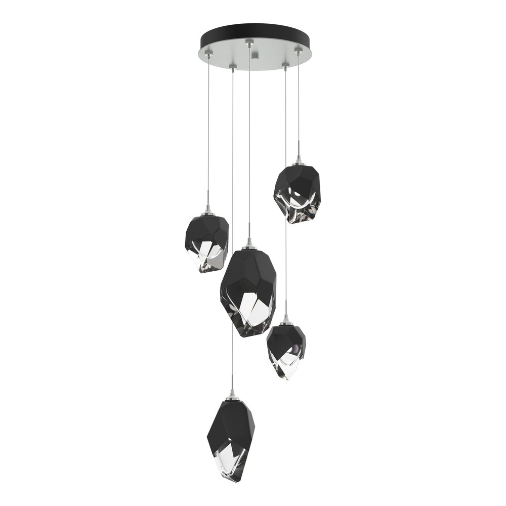 The Chrysalis 5-Light Large Crystal Pendant is a multi-port fixture that features five (2 large + 3 small), handcrafted faceted glass crystals suspended from a round canopy. A thick, clear layer of glass is encased in an outer cocoon of hand-blown, colored glass (matte black or white; all 5 are same color). The lower portion of the outer layer of glass is removed during a hand-polishing process to reveal the inner crystal clear layer below. Each crystal is lit from within. Customizable cable lengths can be shortened to create a dramatic semi-flush.