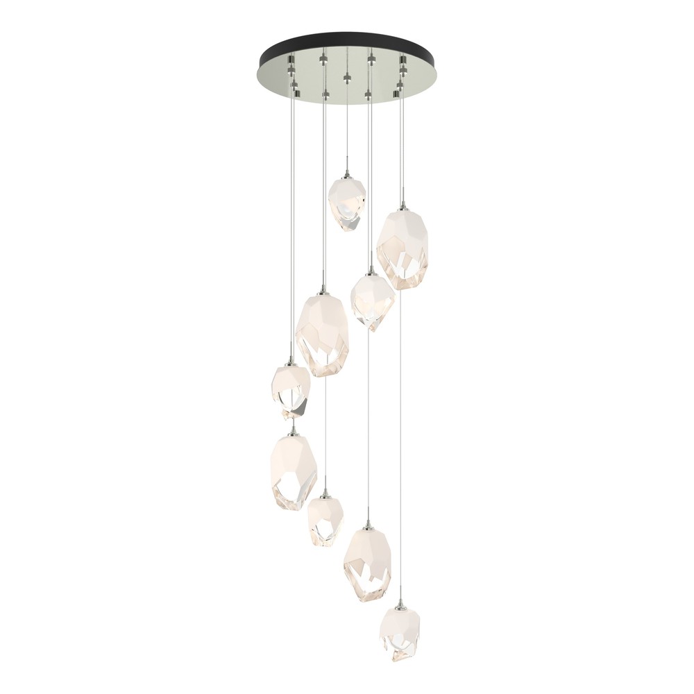 The Chrysalis 9-Light Mixed Crystal Pendant makes a statement in any stairwell or other central or corner space where cascading crystals lit from within create a waterfall of light when pendants are staggered. Highly-customizable, each individual pendant (4 large + 5 small) is suspended via low-voltage cable from its round canopy. A thick, clear layer of glass is encased in an outer cocoon of hand-blown, colored glass (matte black or white; all 9 are same color). The lower portion of the outer layer of glass is removed by hand-polishing it, revealing the inner clear layer below.