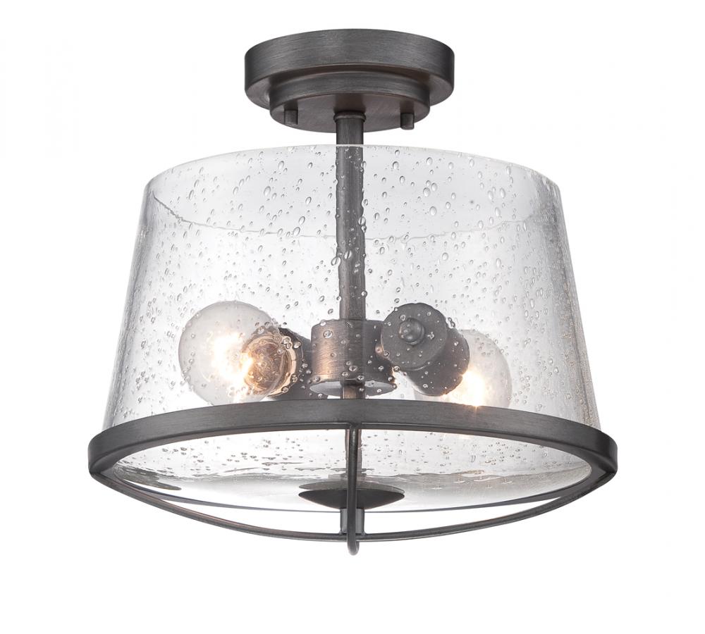 Darby ceiling light fixtures offer smooth lines with a modern cage style accent. The use of rustic materials and warmth of this style has taken hold in today's home interior light fixtures. The protective weathered iron finish adds rustic sophistication to this light fixture. The clear seedy glass shade creates water like appearance and a unique pattern with the light on. These semi flush ceiling lights are built from steel to last for years to come; they are backed by a 1 year limited manufacturer's warranty. These light fixtures install easily. This ceiling light uses 2 screw based light bulbs up to 100-Watt each.