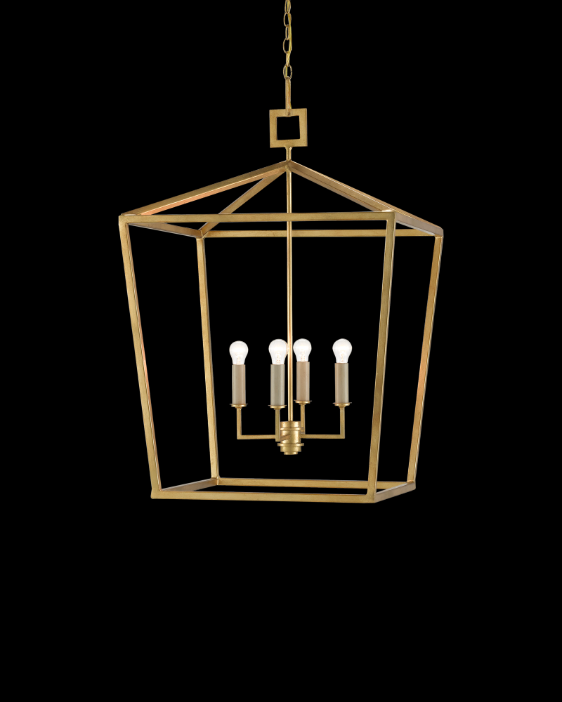 The Denison Gold Large Lantern is a hammered wrought-iron fixture in a contemporary gold leaf finish. The classic lantern shape has stood the test of time to make it one of our most popular offerings. A design element of note is the square that fastens the lantern to the chain. Adjustable from 45.5" to 115.5" with use of included chain/rod kit/cable. If your space calls for a longer drop, additional chain/rods/cable is available for purchase.