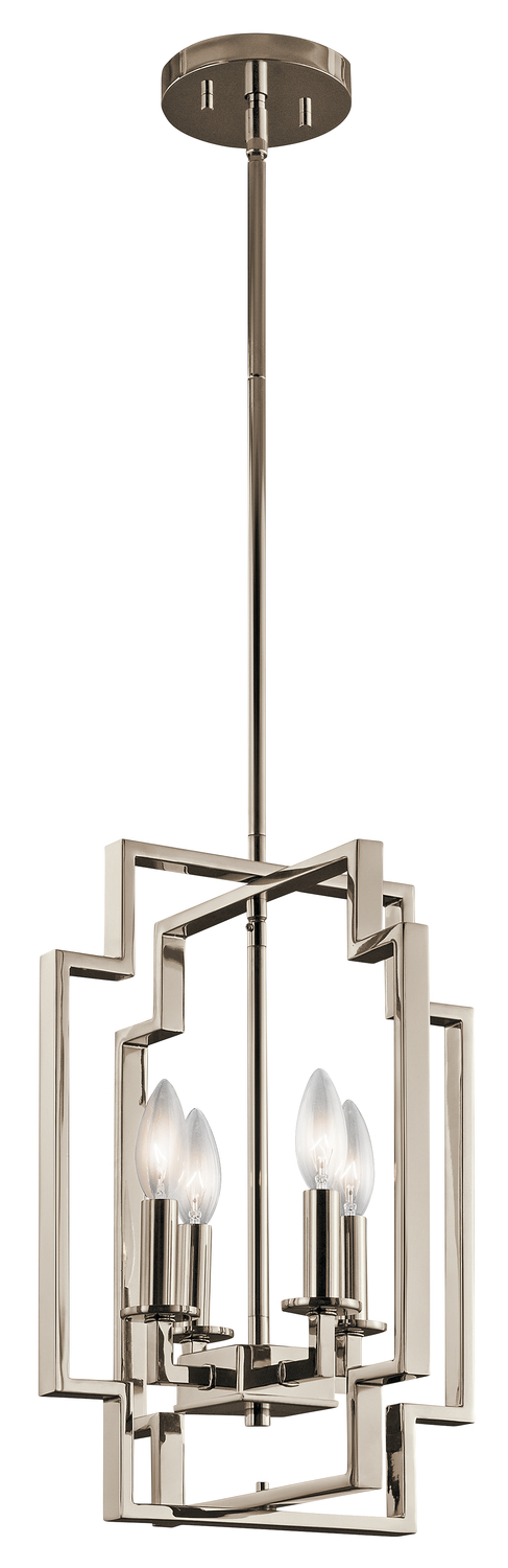 The Downtown Deco 17" 4 light foyer pendant in Polished Nickel features squared edge outer frame that surrounds the curved candle design, allowing the light to fully shine through. The Downtown Deco foyer pendant is perfect in contemporary or mid century modern environments.