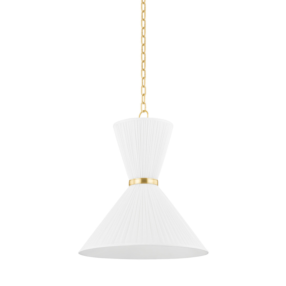 A gathered white linen shade is wrapped in a ring of Aged Brass to create Enid's beautiful, tapered hourglass silhouette. The ruffled look and asymmetry between the top and bottom give the design a loose, flowy element that looks very natural. Add a soothing, soft glow and an organic aesthetic to interiors with this clean, crisp pendant.