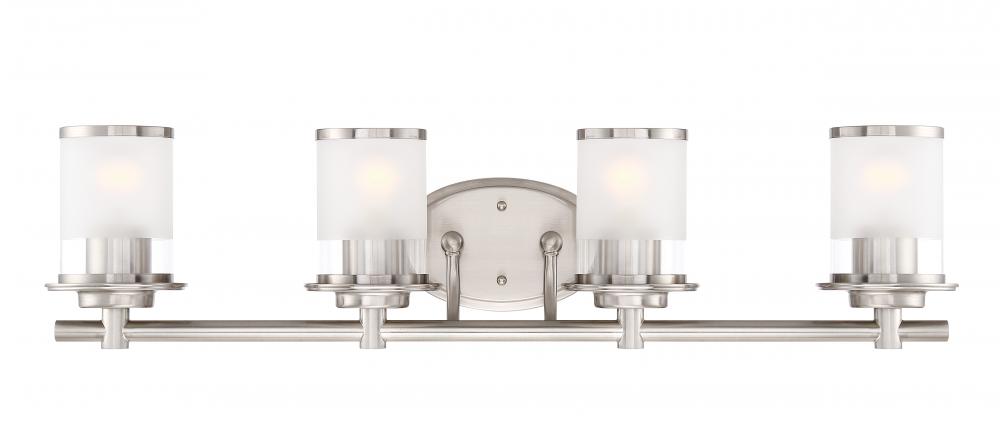 The Essence collection redefines luxury. With its satin platinum finish and clean lines, this 4-light bath bar will be the star of your bathroom. The shades are a unique style that uses two tones of glass, sandy at the top and clear at the bottom. These bathroom lights are designed for damp locations such as over sinks in bathrooms and vanity areas, and they can be mounted with the shades facing up or down.