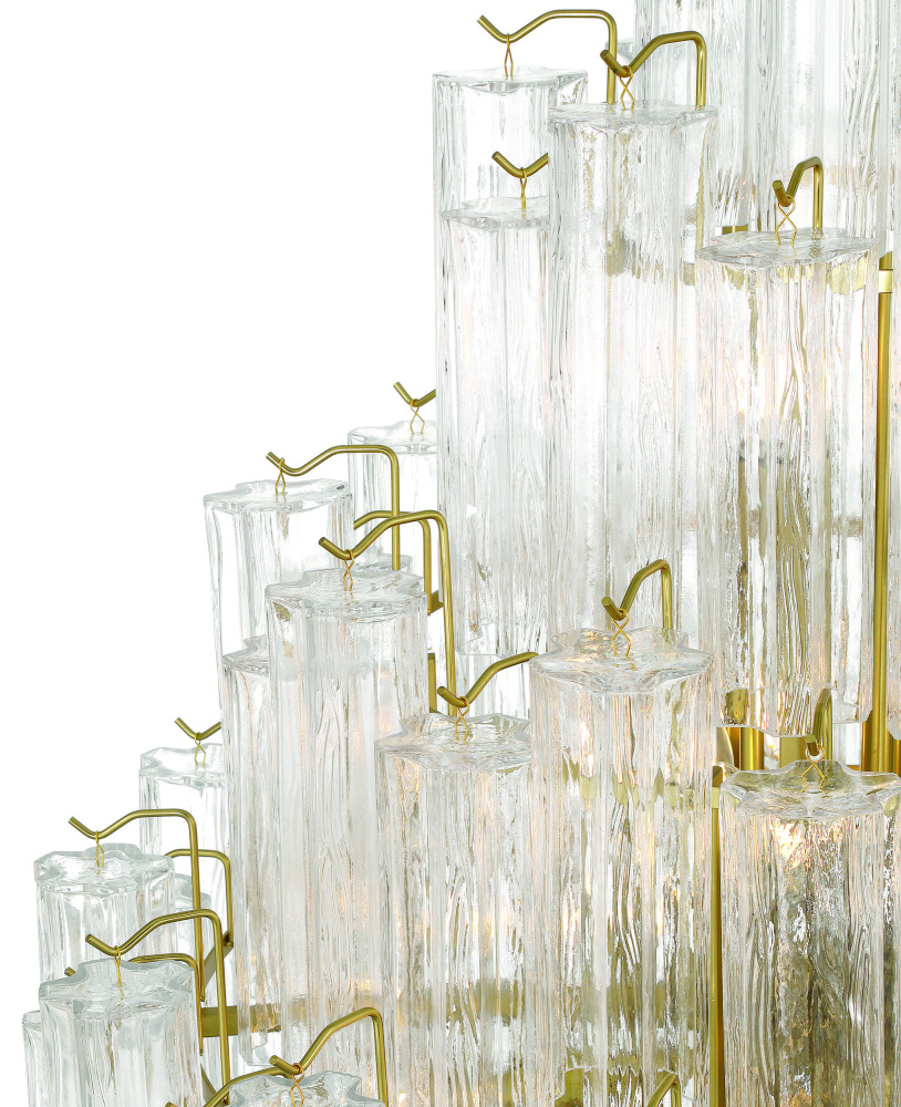 The foyer chandelier from the Sophia collection captivates with its cascading arrangement of ornate “Tronchi” style clear glassware, reminiscent of shimmering icicles. Each glass element delicately refracts light, creating an enchanting glow, while the warm brass frame provides a refined contrast, evoking a sense of luxury. Perfect for classic and modern interiors alike, this design transforms any space into a haven of timeless beauty.
