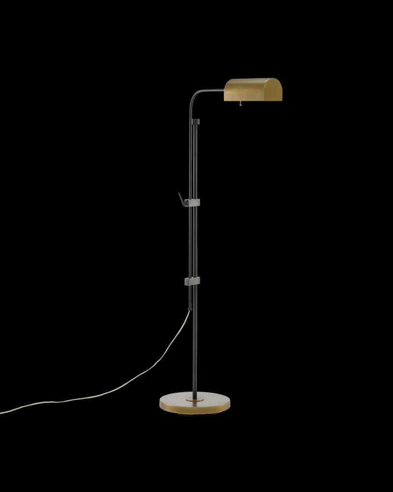 The Hearst Floor Lamp has deftly designed hardware in the interlocking stems that extend from the metal base to the shade. An intermingling of antique brass and oil-rubbed bronze finishes brings this gold lamp an industrial chic vibe. Another nostalgic nod on the lamp is the pull chain.