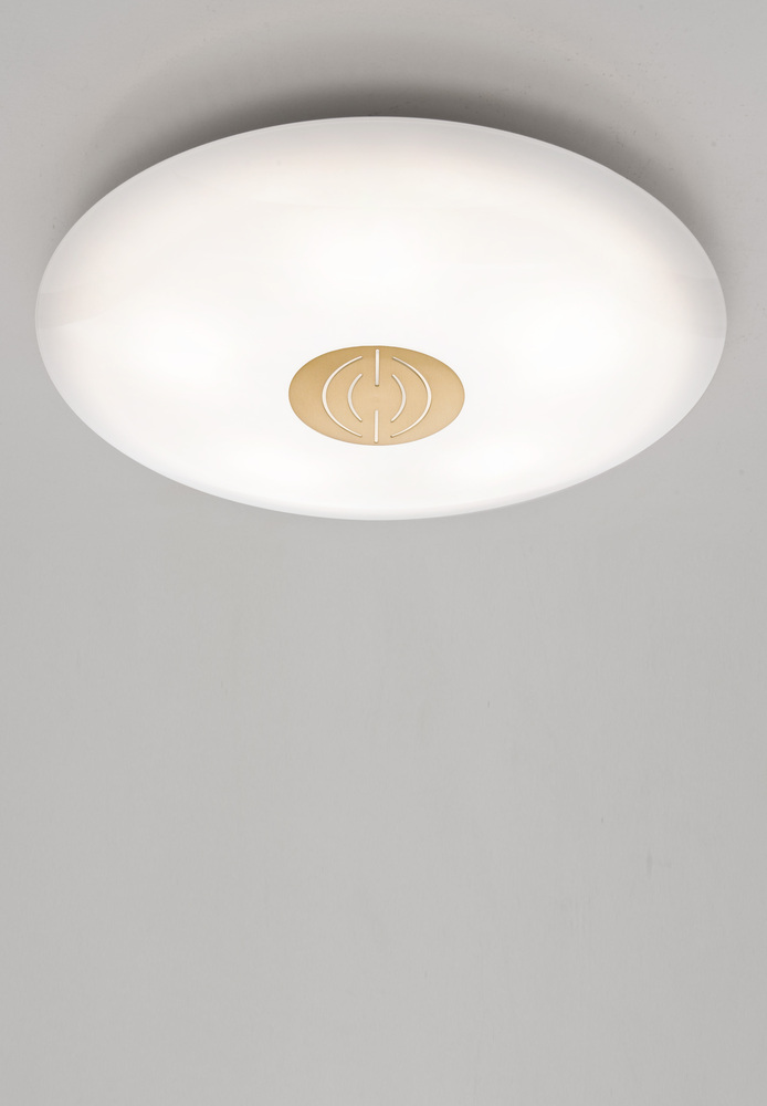 LARGE L.E.D. CEILING FIXTURE, ANTIQUE BRASS DEKOR TRIM WITH SATIN WHITE GLASS