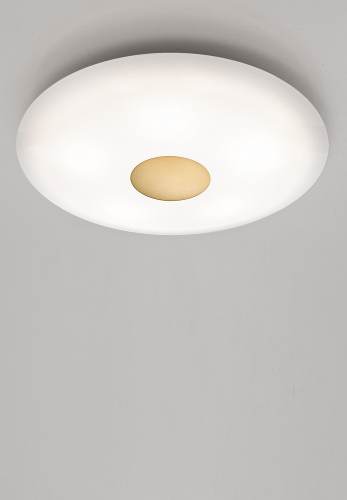 LARGE L.E.D. CEILING FIXTURE, ANTIQUE BRASS SOLID TRIM WITH SATIN WHITE GLASS
