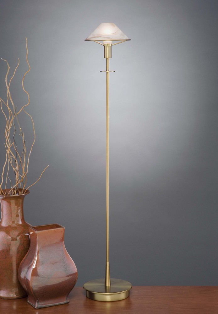 HALOGEN FLOOR LAMP, ANTIQUE BRASS WITH ALABASTER BROWN GLASS