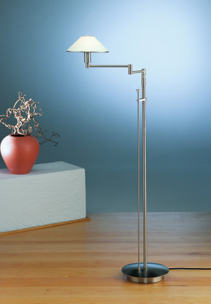 HALOGEN SWING-ARM FLOOR LAMP, SATIN NICKEL WITH SATIN WHITE GLASS