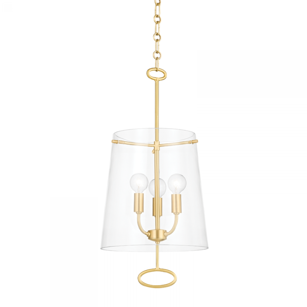 Inspired by early 20th Century Belgian antiques, James is a charming addition to any space. Playing with direction, a series of upward swooping arms are encased by a downward-facing clear glass shade. A smooth metal loop that tilts inward at the top is perfectly complemented by a matching metal loop that tilts outward at the bottom. Choose James as a 3- or 4-light pendant or 2-light sconce in Aged Brass or Polished Nickel.