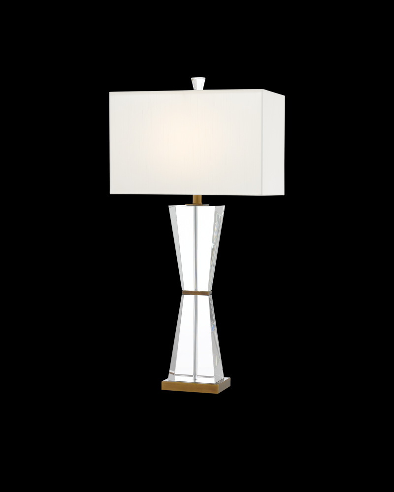 The Laelia Table Lamp is made of optic crystal panels set between metal bars in an antique brass finish. The finial that fastens the off-white shantung shade to the clear lamp is also made of crystal. Design notes worth illuminating are the delicate transparency of the lamp and its shape, which gives it a classic feel.
