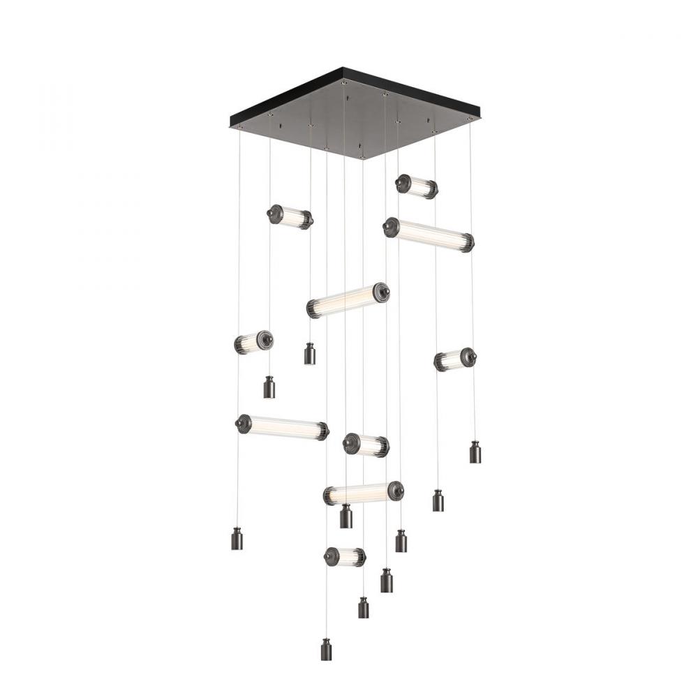 The Libra Collection, with its premier in 2021, features the proven technology of the Abacus Collection's low-voltage cable "rails" that deliver power to LED elements that are encased in glass. The ribbed outer cylinder glass of the Libra adds both a familiar traditional and industrial element that is also reflected in the cast weights at the end of each cable that are reminiscent of those used on vintage scales. The Libra Square LED Pendant features a square canopy, giving dimension to this spectacular pendant with fluted glass tubes that cascade to great lengths, and is customizable. Libra glass components are delivered in both large and small sizes, enabling its owner to personalize both the placement and design. Also available in linear pendant and semi-flush options.
