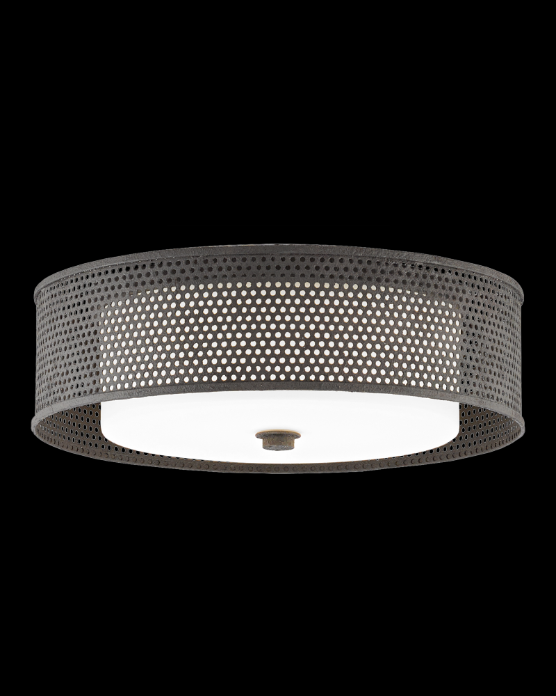Our Notte Flush Mount is made of wrought iron in a Mole black finish. The shade, which has been punched, will create patterns on surrounding surfaces when the lights are on. The acrylic white diffuser on this black flush mount is held into place by a simple finial, also of wrought iron in a Mole black finish.
