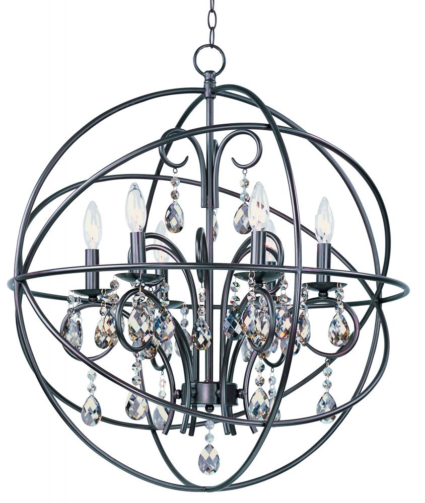 A spherical frame of metal surround a simple line chandelier draped in crystal for a transitional style that fits any interior design. Orbit is available in 2 sizes and 2 finishes, Oil Rubbed Bronze with Cognac crystal and a combo finish of Anthracite and