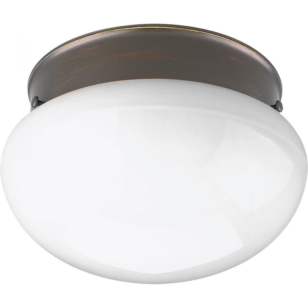 A traditional one-light close-to-ceiling fixture featuring a White glass bowl and an Antique Bronze finish. The fixture is ideal in a bathroom setting or hall/foyer.