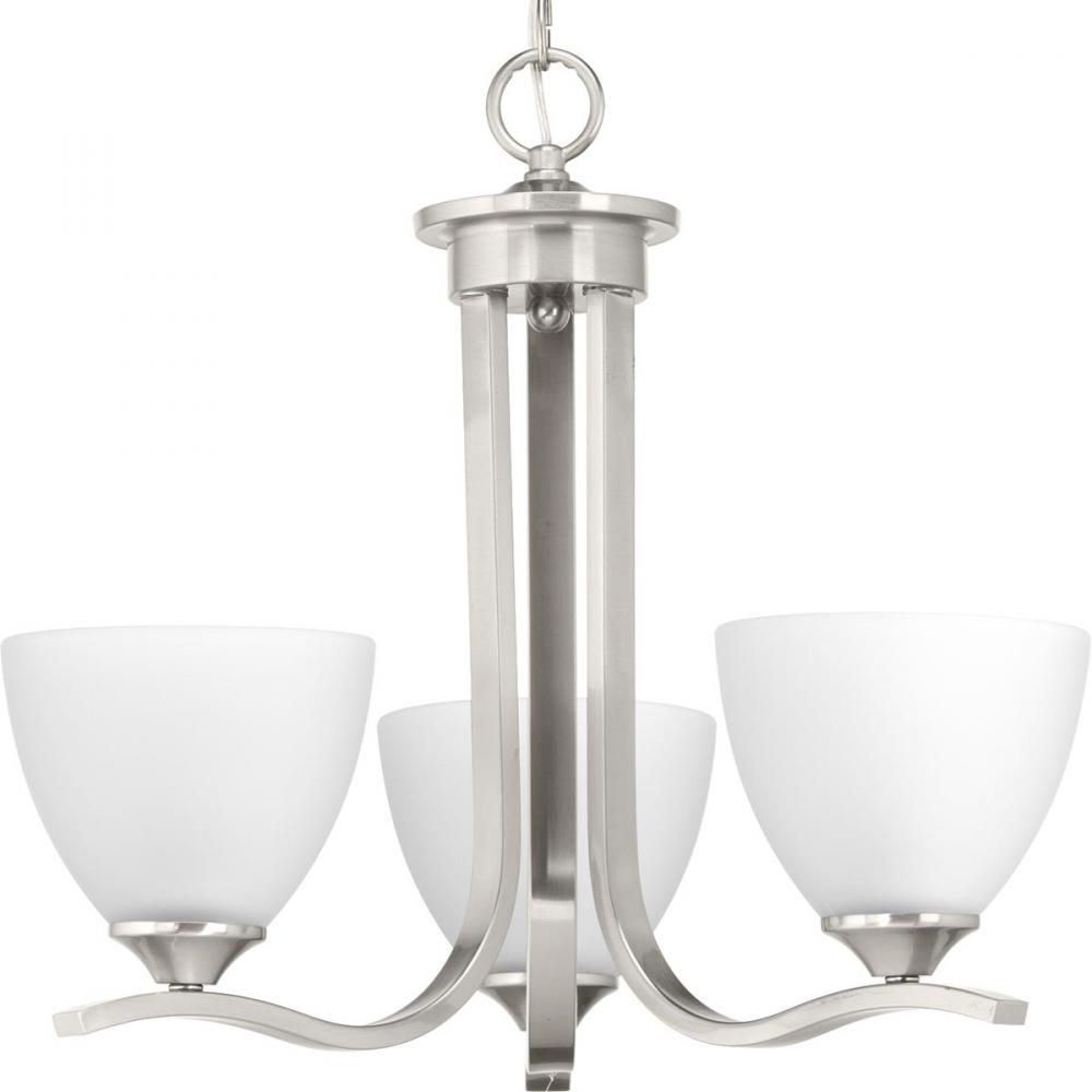 The Laird collection provides a contemporary complement to casual interiors popular in today's homes. Glass shades add distinction and provide pleasing illumination to any room, while scrolling arms create an airy effect. Three-light chandelier in an Brushed Nickel finish.