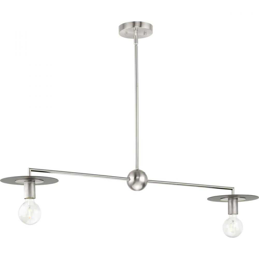 An intriguing flat disc shade forms the basis of the Trimble Collection, whose mid-century modern inspiration is perfect for open spaces in mid-century modern and luxe industrial settings. A two-toned finish on the shade features subtle brushed nickel and crisp graphite, plus a knurled metal lamp socket is coated in brushed nickel providing additional rich visual interest. Use vintage-style bulbs to add modern appeal and to cast crisp illumination to kitchens, bars and dining rooms.