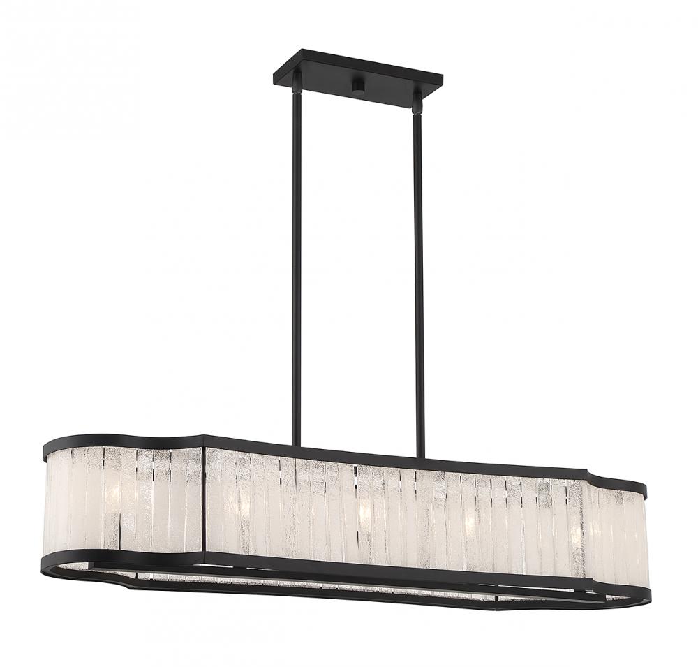The timeless beauty of the quatrefoil inspired the shape of the Parkside 5-light trestle. Its curving frame is adorned with slats of antique glass for a beautifully textured look that softens the glow. Matte black finish. Parkside is 12" in width, 42" in length and has an adjustable height ranging from 13.75" to 61.75". It uses 5 candelabra size bulbs of up to 60 watts per bulb (bulbs not included). Comes with eight 12" downrods and two 6" downrods.