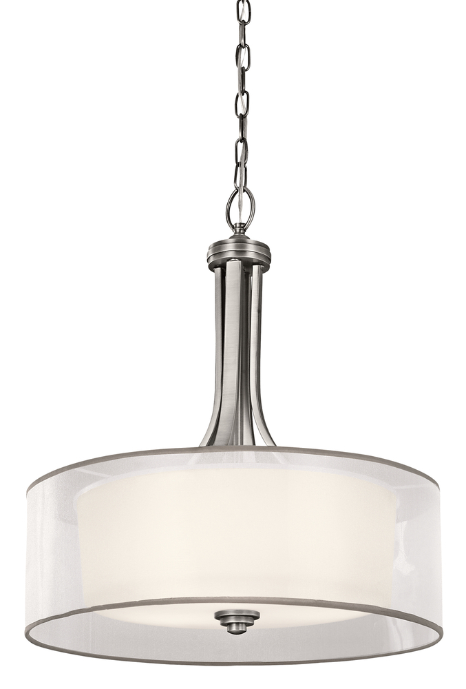 The Lacey™ 23.5" 4 light pendant features a classic look with its Venetian detail of curves in Antique Pewter finish and satin etched cased opal inner diffusers and white translucent organza outer shade. The Lacey pendant is perfect in several aesthetic environments, including transitional and traditional.