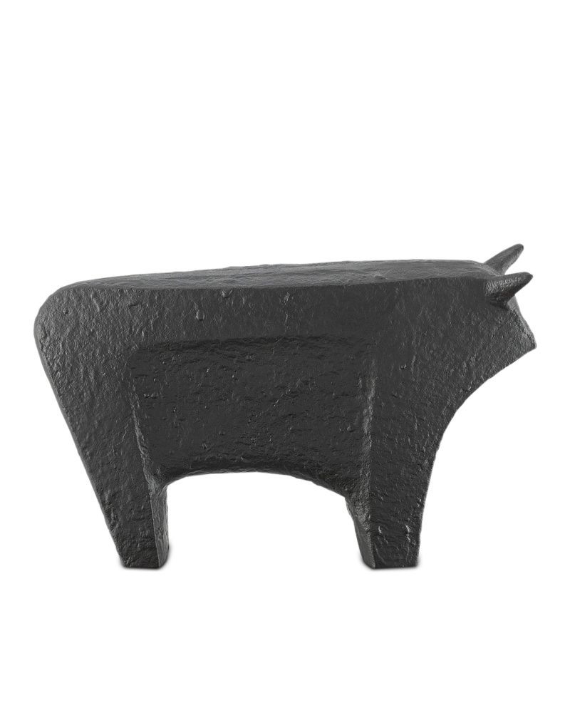 The Sampson Large Black Bull is made of cast aluminum in a textured matte black finish. The mottled surface brings this decorative black sculpture with its implied features an extra dose of charm.