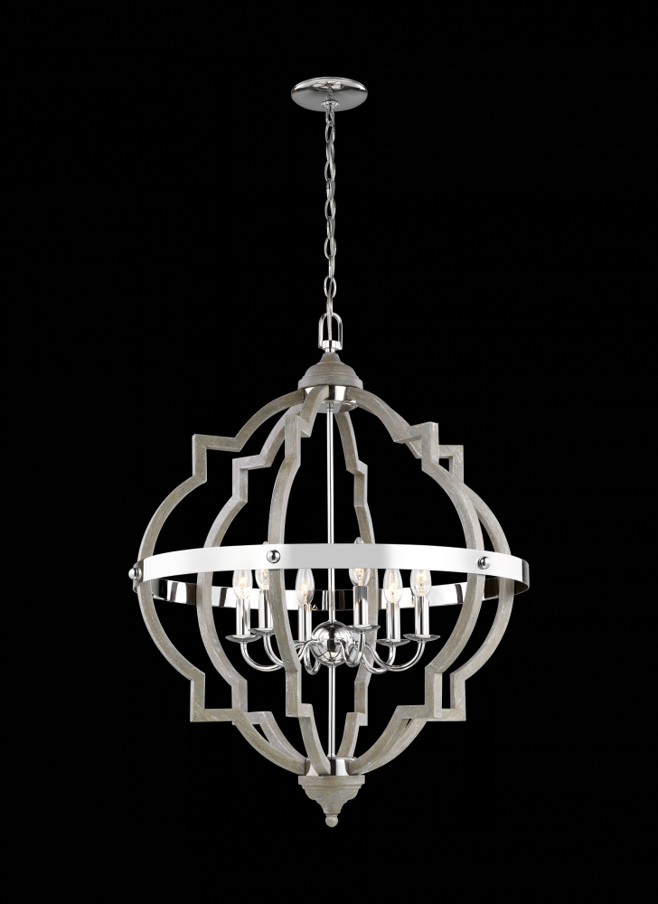 The Socorro six light indoor pendant in washed pine is the perfect way to achieve your desired fashion or functional needs in your home. The transitional Socorro lighting series by features a classic, barbed Quatrefoil profile - wholly updated by combining a distressed Cerused Oak finish on the decorative silhouette with the rich Stardust finish on the metal bobeches and decorative strapping to create undeniable rustic charm. While still offered in its original finish Stardust, the Socorro has been beautifully updated with our popular Washed Pine and Chrome finish to offer a modern take on this timeless industrial beauty. The collection includes a four-light mini-chandelier, medium and large six-light chandeliers, and four-light and six-light hall / foyer pendants. Incandescent candelabra base lamping.