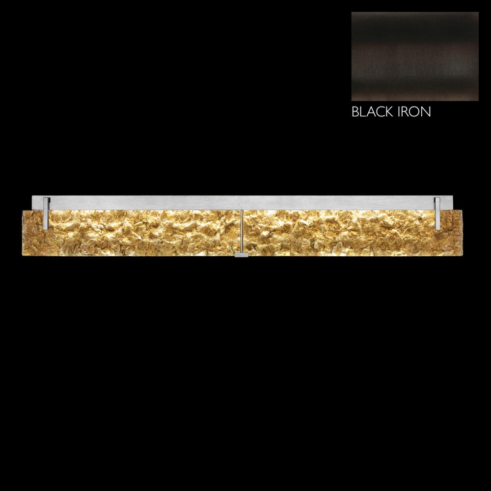 Luxury bath fixture features a three-dimensional contrast of deep textured and polished cast glass. This stunning landscape of the glass, illuminated by waterproof LEDs, is available in clear or highlighted with antiqued gold leaf. Choice of four finishes, champagne tinted gold leaf finish, silver leaf, bronze or hand rubbed black iron. For Indoor use only.