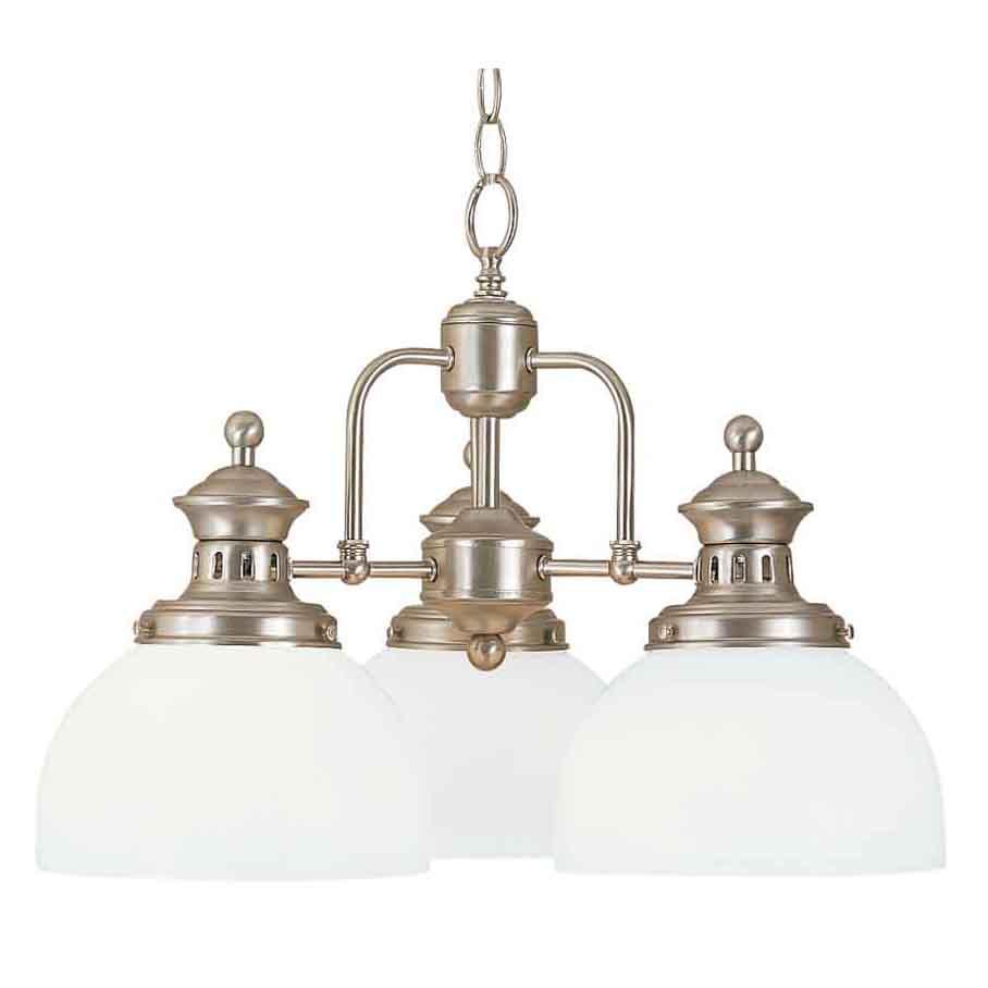 This Three Light Down Chandelier has a Nickel Finish and is part of the Palor Collection.