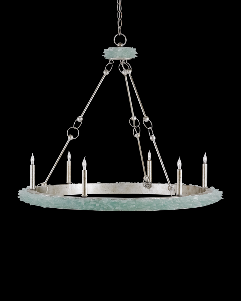 The Tidewater Chandelier, ringed in natural sea glass, is a nod to nautical luxury. Where the silver chandelier isn't covered in pale aqua glass, it has a gleaming silver Granello finish. Adding to the luxe feel, the arms that attach the upper ring to the lower one have sophisticated interlocking accents. Adjustable from 36" to 103" with use of included chain/rod kit/cable. If your space calls for a longer drop, additional chain/rods/cable is available for purchase.