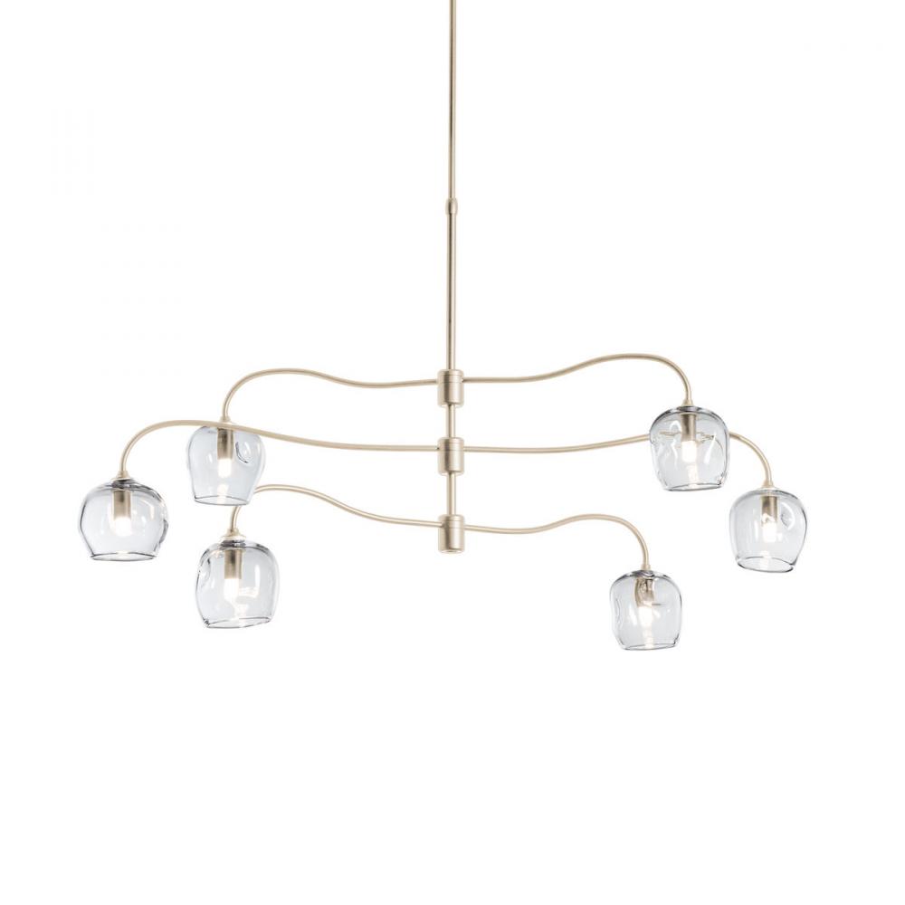 Oval three-tier six light pendant chandelier with glass options. Steel arms are fixed in position. Clear and Cool Grey glass options feature the thumbprint glass while the Frosted glass option will have an organic dome shape.